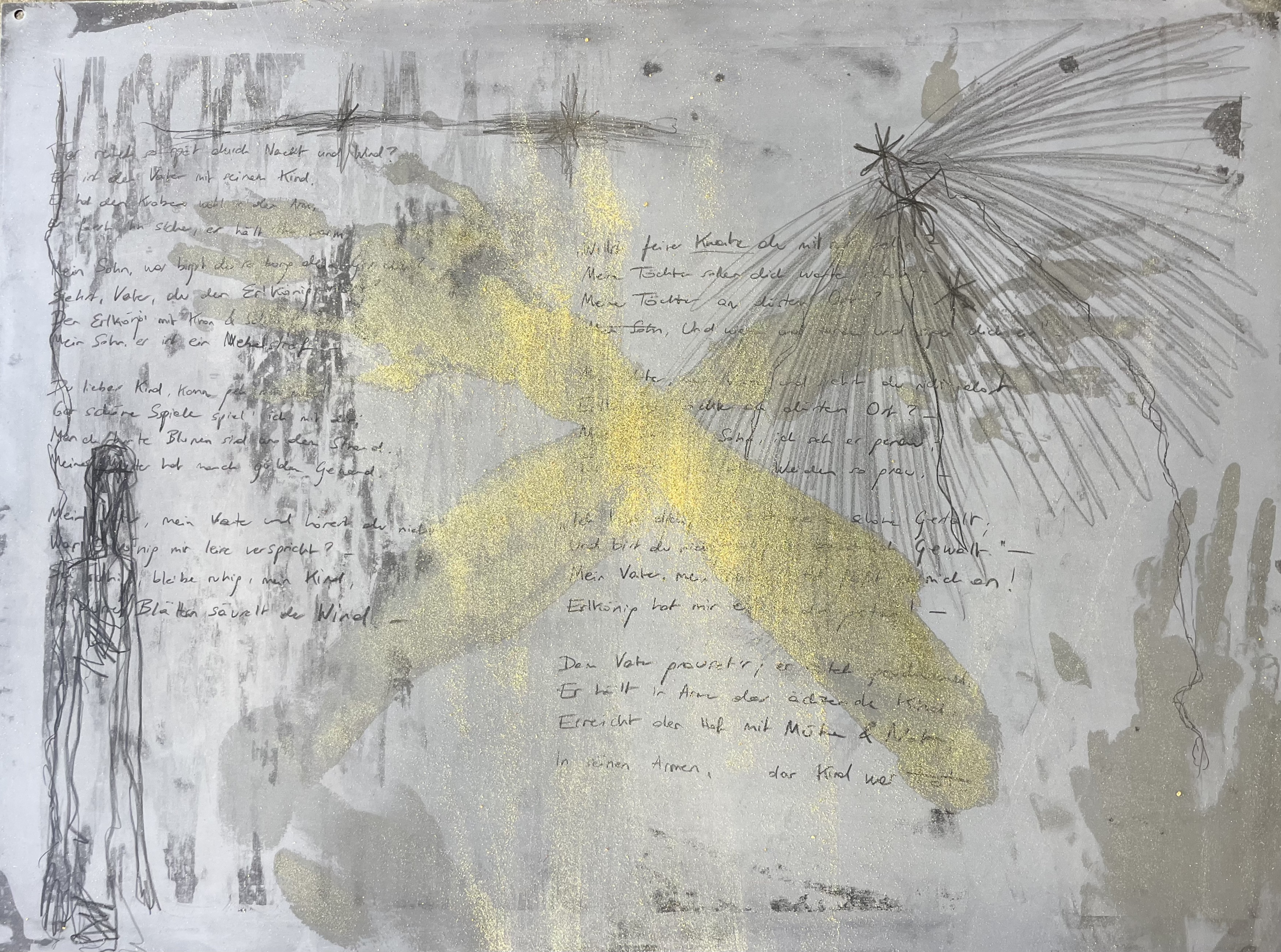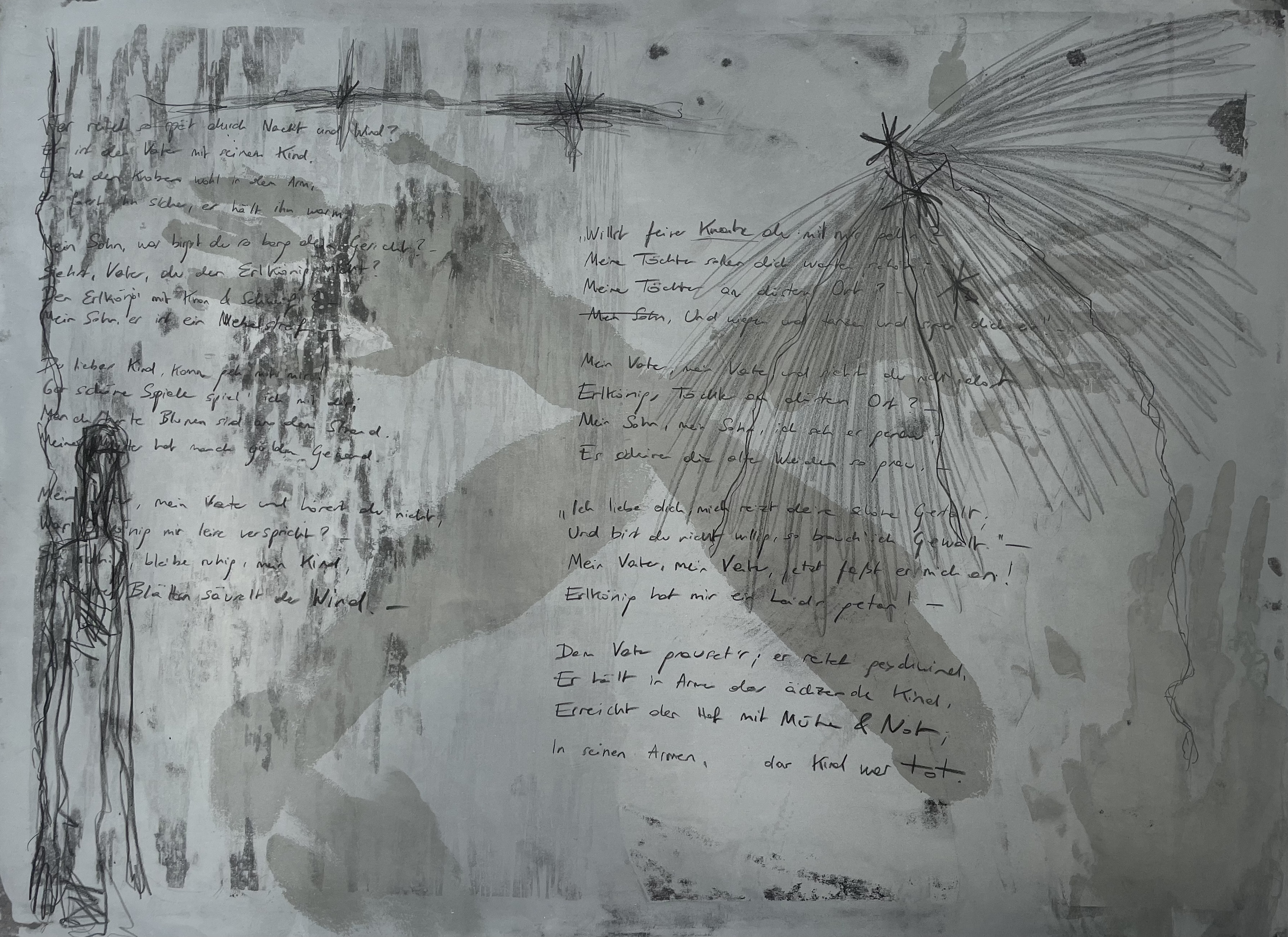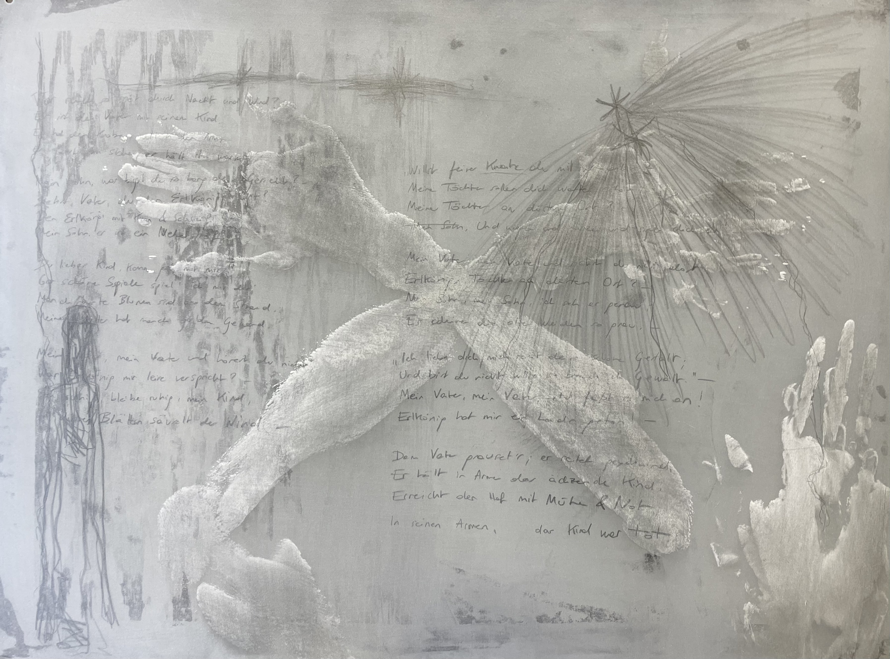 Inspired by Jasper John’s lithograph ‘Skin With O’Hara Poem’, where he incorporated text within an impression of his face and hands, I started working with Goethe’s poem ‘Erlkönig’ that I feel deeply connected to, combining the process of handwriting and using my body as a mark-making tool directly, visually describing my emotional relationship with death and grief.